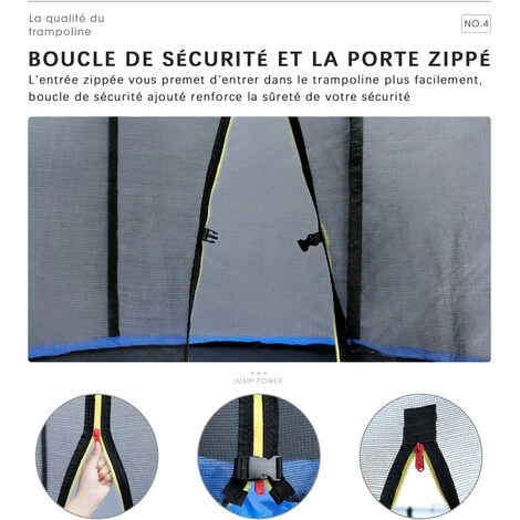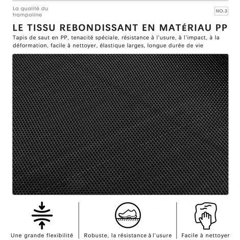 【Excellente Performance de rebond】Coussin en tissu de haute résistance offrant une résistance de rebond inégalée. Notre trampoline a été testé pendant 10000 cycles et le tapis a été testé pendant 3000 heures pour résister à un poids de 150 kg.