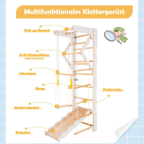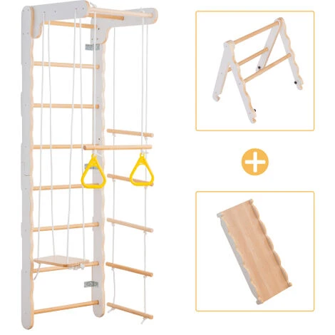 Cadre d’escalade multifonction 6 en 1 : en tant que salle de gym multifonctionnelle pour les enfants, cette salle de gym en bois 6 en 1 a six fonctions différentes, y compris une balançoire, une paire d’anneaux, un rampement. échelle, un toboggan, un portique d’escalade vertical et une salle de gym jungle à angle droit. Cette aire de jeux combinée ne prend pas beaucoup d’espace latéral, peu importe l’espace qui peut être facilement placé. 61,7 * 60 * 199 cm,Taille de la diapositive : 95,5 * 40 cm , tige ronde de diamètre: 3 cm, taille du siège de la balançoire : 40 * 18 cm,Longueur de la tige de l’échelle : 42 cm, tour de jeu de longueur de barre ronde : 56,5 cm