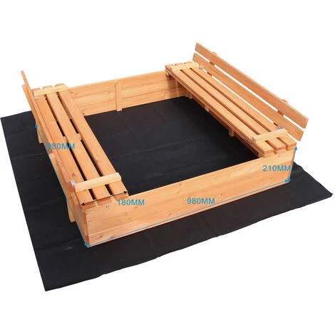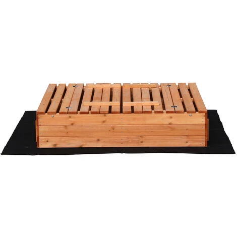 Les dimensions totales du bac à sable sont de 98 x 98 x 21 cm lorsqu’il est fermé. Une fois déployées, les planches du couvercle offrent une largeur d’assise de 18 cm. Le sol est équipé d’un non-tissé solide pour éviter la croissance des mauvaises herbes et le stockage des eaux de pluie.