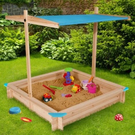 Offrez à vos enfants un espace de jeux en plein air comme à la plage avec ce bac à sable !Celui-ci deviendra rapidement l’endroit préféré de vos enfants, et les encouragera à jouer dehors dès que les beaux jours feront leur apparition !Avec ses bonnes dimensions de L.115 x l.115 x H.117 CM, vos enfants pourront profiter d’un grand espace rien qu’à eux pour développer leur imagination en construisant de grands châteaux de sable avec leurs amis et jouer comme s’ils étaient à la plage !Son toit amovible avec sa toile en tissu bleue de 120 gr/m² protègera vos enfants des rayons du soleil en cas de fortes chaleurs ! Astuce : pensez à incliner le toit en fonction de l’orientation du soleil ! Il vous servira également de toit pour refermer le bac à sable lorsque vos enfants n’y jouent pas et ainsi protéger le sable de l’humidité.Les bords du bac à sable de 8.5 cm de large, ont également été pensés afin que vos enfants puissent s’y assoir pendant qu’ils jouent.Ce bac à sable est simple et rapide à assembler et résistant aux intempéries.Alors laissez-vous tenter et offrez à vos enfants des moments d’amusement et de joie comme à la plage, depuis votre jardin !Dimensions du bac à sable avec toit ouvrant bleu– Dimensions hors tout : Longueur 115 CM x largeur 115 CM x Hauteur 117 CM– Matière : Structure en bois, toile en tissu– Couleur de la structure : bois naturel– Épaisseur de la structure : 1,5 CM– Densité/Grammage de la toile : 120 gr/m²– Couleur de la toile : bleu– Contenance : 182 litres– Dimensions intérieures : L.98,5 x l.98,5 x H.19,5 CM– Dimensions de la toile : L.115 x l.101,5 CM– Largeur de l’assise : 8,5 CM– Certifications : EN71-1 / EN71-2 / EN71-3Ce bac à sable existe également dans un autre coloris : – Bac à sable KIDS bois avec toit ouvrant grisRetrouvez tous nos jeux d’extérieur sur notre boutique en ligne !