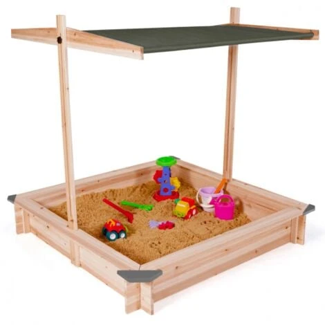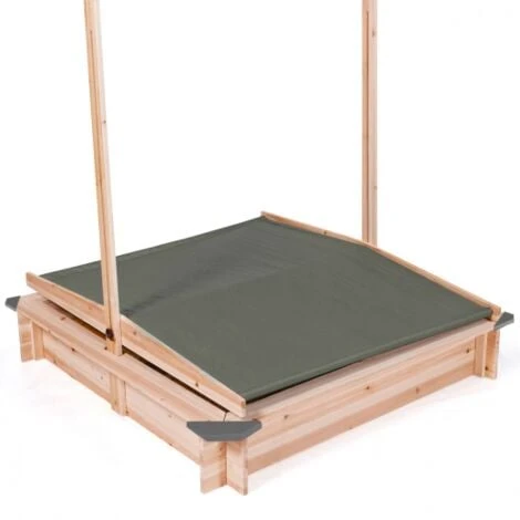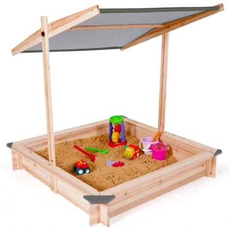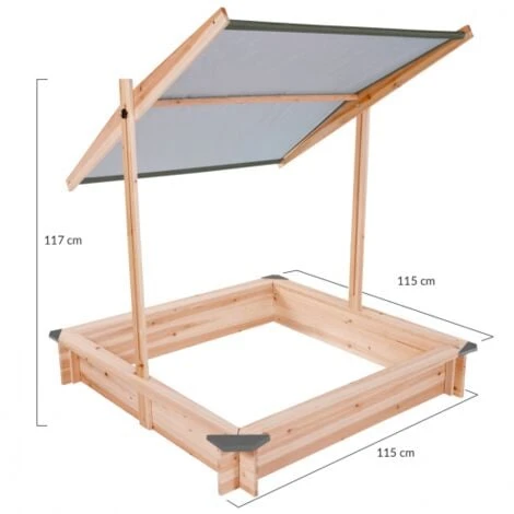 Offrez à vos enfants un espace de jeux en plein air comme à la plage avec ce bac à sable de 115 x 115 CM au toit ouvrant gris !Celui-ci deviendra rapidement l’endroit préféré de vos enfants, et les encouragera à jouer dehors dès que les beaux jours feront leur apparition !Avec ses larges dimensions de L.115 x l.115 x H.117 cm, vos enfants pourront profiter d’un grand espace rien qu’à eux pour développer leur imagination en construisant de grands châteaux de sable avec leurs amis et jouer comme s’ils étaient à la plage !Son toit amovible avec sa toile en tissu grise de 120gr/m² protègera vos enfants des rayons du soleil en cas de fortes chaleurs !Astuce : pensez à incliner le toit en fonction de l’orientation du soleil ! Le toit vous servira également pour refermer le bac à sable lorsque vos enfants n’y jouent pas et ainsi protéger le sable de l’humidité.Les bords du bac à sable de 8,5 cm de large, ont également été pensés afin que vos enfants puissent s’y asseoir pendant qu’ils jouent.Ce bac à sable est simple et rapide à assembler et résistant aux intempéries.Alors laissez-vous tenter et offrez à vos enfants des moments d’amusement et de joie comme à la plage, depuis votre jardin !Dimensions du bac à sable avec toit ouvrant gris– Dimensions hors tout : Longueur 115 CM x largeur 115 CM x Hauteur 117 CM– Matière : Structure en bois, toile en tissu– Couleur de la structure : bois naturel– Épaisseur de la structure : 1,5 CM– Densité/Grammage de la toile : 120 gr/m²– Couleur de la toile : gris– Contenance : 182 litres– Dimensions intérieures : L.98,5 x l.98,5 x H.19,5 CM– Dimensions de la toile : L.115 x l.101,5 CM– Largeur de l’assise : 8,5 CM– Certifications : EN71-1 / EN71-2 / EN71-3Ce bac à sable existe également dans un autre coloris : – Bac à sable KIDS bois avec toit ouvrant bleuRetrouvez tous nos jeux d’extérieur sur notre boutique en ligne !