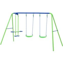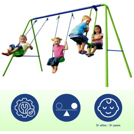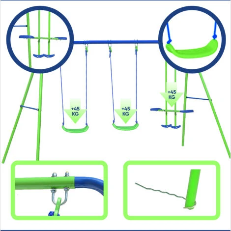 Profitez du plein air avec votre famille grâce à cette balançoire de jardin dotée d’un portique en métal et d’une finition en poudre pour résister aux intempéries. Le cadre de la structure permet l’installation d’un siège en forme de « U » supportant jusqu’à 45 kg de charge et enveloppant l’enfant pour plus de sécurité. La longueur de la corde permet de l’adapter à différentes hauteurs jusqu’à un maximum de 170 cm. Matériau en PVC avec traitement UV pour protéger la peinture et prolonger sa durée de vie à l’extérieur. NON toxique pour les enfants et certifié EN71. L’âge recommandé pour ce produit est de 3 à 8 ans. Elle dispose d’ancrages au sol pour la fixer et assurer une grande stabilité pendant le mouvement.nnCaractéristiques :n- Dimensions: 280x140x180 cm.n- Dimensions du siège : 36x18x8 cm et 21x20x4 cm.n- Longueur de la corde : 170 cm.n- Poids maximal supporté : 45 kg par siège ou 180 kg simultanément.n- Matériau : PVC, métal, corde.n- Couleur : vert et bleu.n- Poids : 22 kg.n- Épaisseur des tubes métalliques : 1 mm.n- Montage : Vis, écrous et rondelles.n- Espace recommandé : 20 m².n- Âge recommandé : 3-8 ans.nn*Installer à l’extérieur sur une surface propre et nivelée, à au moins 2 mètres de tout autre objet, mur, etc. Utiliser sous la surveillance d’un adulte.
