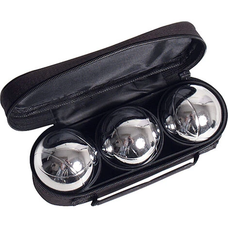 Jeu de boules de luxe composé de trois boules en métal, d’un cochonnet en bois et d’un ruban à mesurer dans une mallette solide.
