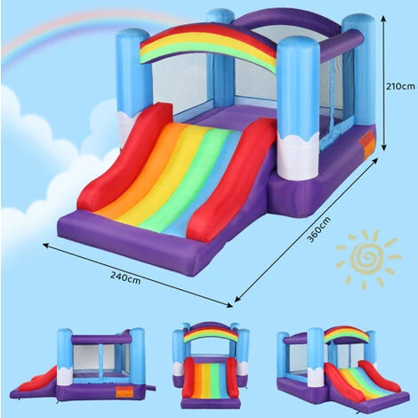 1.Cherchez-vous un château gonflable pour votre enfant ? Ce mini château gonflable pourrait être exactement ce dont vous avez besoin ! Fabriqué en tissu Oxford de haute qualité, il est flexible et durable ! Il dispose de deux aires de jeux pour enfants avec un trampoline et un toboggan ! Avec une capacité de charge maximale de 135 kilogrammes, il convient aux enfants de 3 à 10 ans ! Il a une maille respirante pour une bonne circulation de l’air ! Avec des couleurs arc-en-ciel riches et un espace de jeu suffisamment spacieux, votre enfant aimera cette activité !