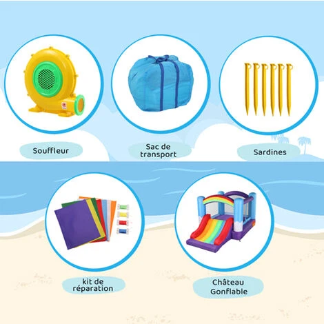 4.Accessoires riches : Notre château gonflable est livré avec un sac de rangement pour que vous puissiez le stocker lorsque vous ne l’utilisez pas ou après avoir dégonflé. De plus, le château gonflable est également livré avec un kit de réparation pour faciliter votre utilisation.