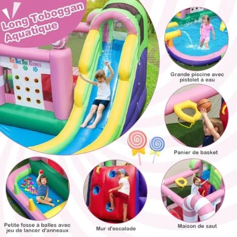 - 【Parc aquatique bonbons:】Le château gonflable avec des décorations de bonbons sucrés combine un long toboggan aquatique avec une zone gonflable amusante, un mur d’escalade, une grande pataugeoire et une petite piscine à balles, etc.