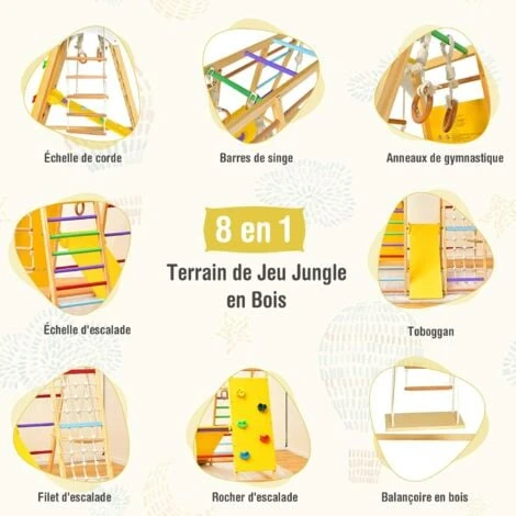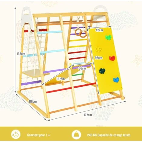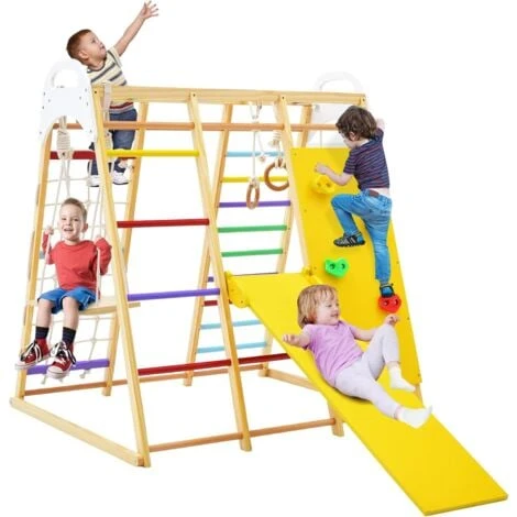 - Cet ensemble de jeu d’escalade 8 en 1 en bois sera un cadeau idéal pour vos enfants. Il y a des barres de singe, des anneaux de gymnastique, une échelle, un filet, une échelle de corde, un rocher d’escalade, un toboggan et une balançoire en bois.