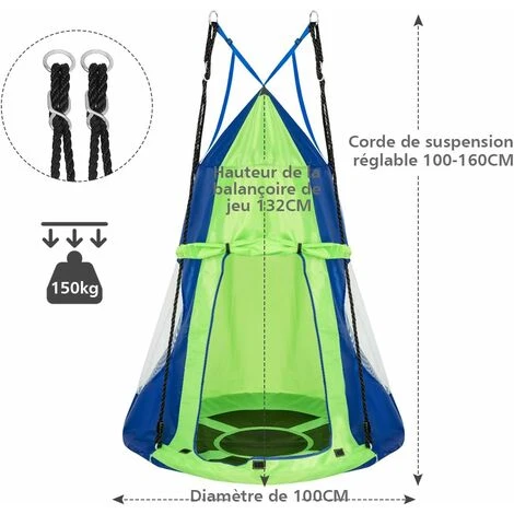 - 【Utilisation pratique】La balançoire nid d’oiseau a un diamètre 100cm, et la charge maximal 150kg, c’est une grande place pour supporter plus d’un enfant même les adultes peut utiliser cette balançoire, en outre la corde peut être réglée la hauteur de 100 à 160cm, c’est très pratique pour une famille