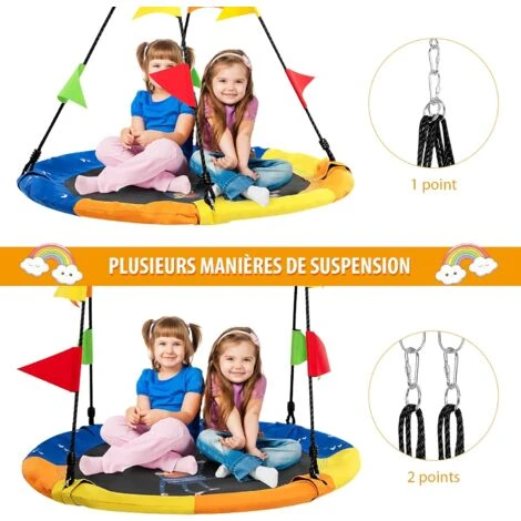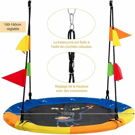 - Cette balançoire en forme de nid est parfaite pour que vos enfants s’amusent. Fabriquée en Oxford de qualité et avec un cadre en acier résistant, elle est résistante pour une utilisation à long terme. La hauteur peut être ajustée de 100 cm à 160 cm, en fonction de la taille des enfants. Les cordes et les crochets solides garantissent une utilisation en toute sécurité. La structure supporte une charge de 150kg, permettant à un enfant mais aussi à 2/3 enfants jouant ensemble. En outre, elle est facile à assembler pour une utilisation dans un jardin, une cour ou un parc.
