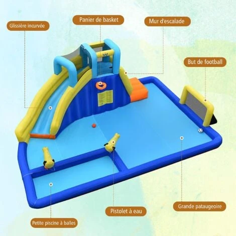 - 【 6-en-1 château gonflable】 Cette aire de jeux aquatiques offre un large éventail d’activités aux enfants. Ils peuvent profiter des toboggans, de l’escalade, du basket-ball, des matchs de football, des piscines et des combats de pistolets à eau avec leurs amis.