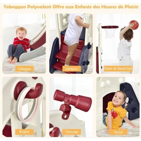 - Avec un toboggan extra long et large, un mur d’escalade,un tunnel, un panier de basket et un télescope, vos enfants passeront desheures à s’amuser dans différentes aires de jeux. De plus, le mur d’escalade àbascule et l’échelle à 3 marches augmentent le plaisir et la commodité. Plusimportant encore, les mains courantes améliorées des toboggans et de la zoned’attente maximisent la sécurité. Cet ensemble mur d’escalade et tobogganconvient aux enfants de 3 à 8 ans.