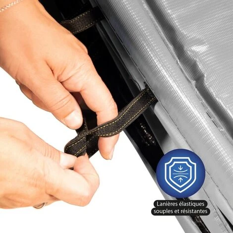 Equipé de lanières élastiques solides et résistantes pour fixer facilement la housse de protection à la base du trampoline.