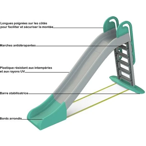 Ce toboggan est équipée de 6 marches et offre une longueur de glisse de 240 cm.