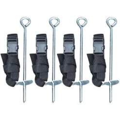 Ce kit d’ancrage est nécessaire pour fixer le trampoline au sol, et permet de le maintenir lors de fortes rafales de vent.