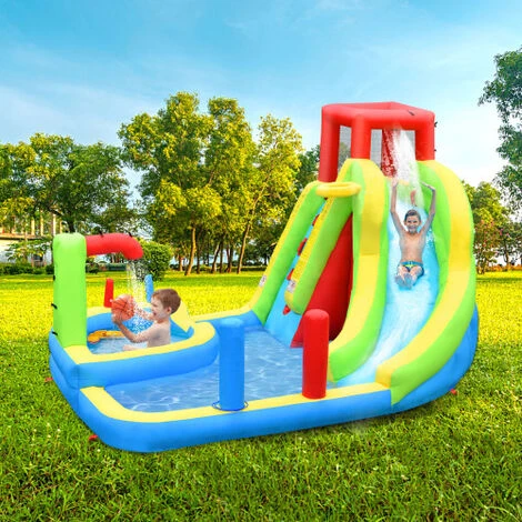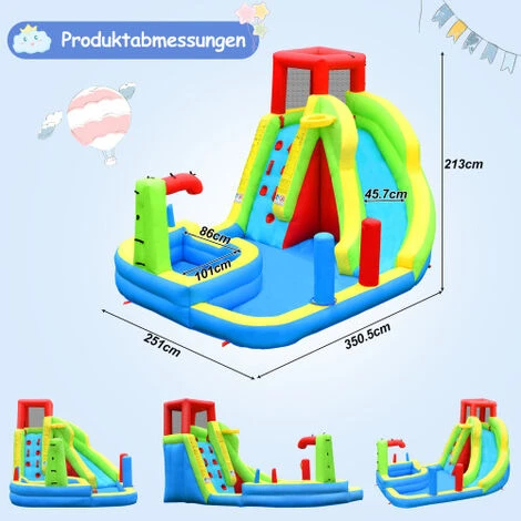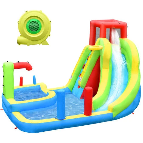 Ce produit a plus de 6 fonctions de jeu différentes pour vos enfants. Dans la piscine d’eau, les enfants peuvent lancer des cercles et aussi tirer au basket. Nagez et baignez-vous dans une piscine séparée. Les enfants s’amusent plus en glissant sur le long toboggan. Lorsque le pilier est connecté au tuyau d’eau, les enfants peuvent s’amuser en jouant avec l’eau dans la piscine en été. De plus, les enfants peuvent pratiquer l’escalade. Ce château gonflable fonctionnel offre un plaisir sans fin aux enfants et aux amis.