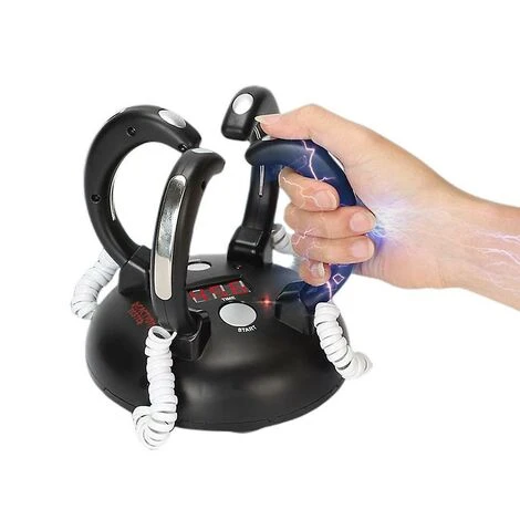Comment ça marche : chaque joueur saisit une poignée de la base. Appuyez sur le bouton au centre, regardez le voyant rouge clignoter et écoutez la musique à suspense. Attendez… Quand le feu rouge passe au vert, allons-y. Appuyez sur le bouton de déclenchement dès que possible. Le dernier réagit et reçoit un choc électrique.