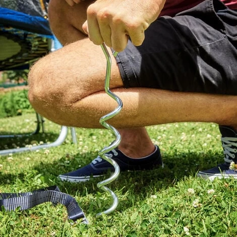 Ce kit de 8 se compose de 4 piquets d’ancrage spiralés ainsi que 4 sangles de serrage en polyester très résistantes aux déchirures. Les piquets d’ancrage en acier galvanisé apportent une sécurité idéale aux tentes, trampolines et tous autres équipements extérieurs.