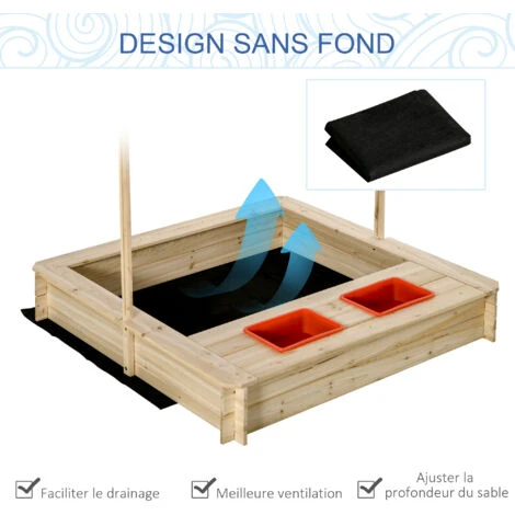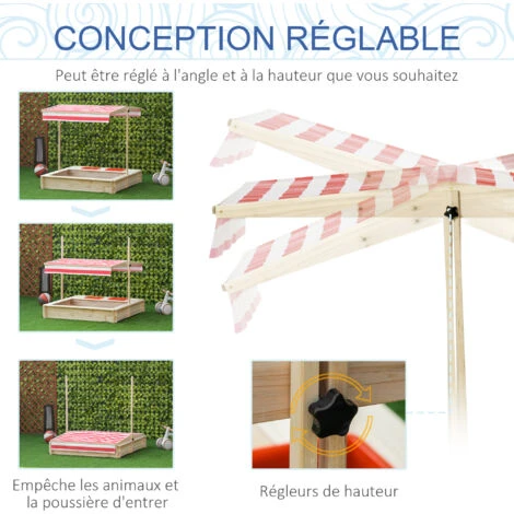 – Bac à sable doté d’un toit en polyester haute densité de hauteur et inclinaison réglables, idéal pour protéger vos enfants du soleil le jour, et préserver la propreté du sable la nuit (fonction couvercle)