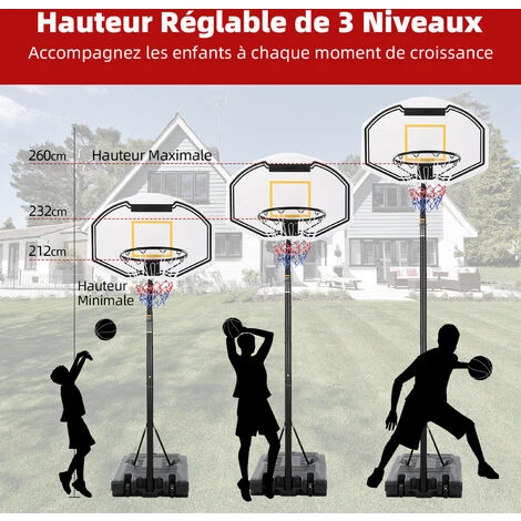 Le panier de basket peut être ajustés librement de 212 à 260 cm. Ce panier de basket convient non seulement aux adolescents de tous les âges qui aiment le basket-ball, mais également aux adultes qui jouent au basket-ball pour une détente. Vous pouvez facilement ajuster la hauteur en tournant simplement les vis sur la tige télescopique et jouer un match de basket-ball à tout moment et n’importe où. La tige télescopique en métal permet une utilisation prolongée. Il suffit de régler la hauteur optimale et le match peut commencer!