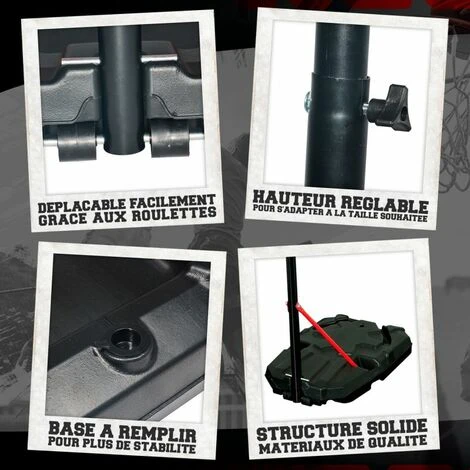 - Le Socle en polyéthylène est à remplir avec du sable OU avec de l’eau pour encore plus de stabilité. Il est équipé de roulettes amovibles afin de faciliter la mobilité.