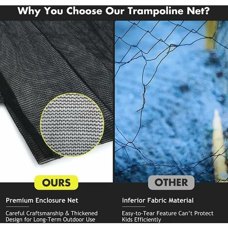 Matériau PE de haute qualité : ce filet de rechange pour trampoline est fabriqué en matériau PE résistant à la déchirure, qui est durable et étroitement lié pour protéger les enfants tout en sautant.