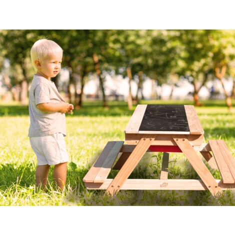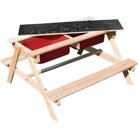 La table de pique-nique Sable et Eau Dual Top 2.0 de Sunny a tout en un ! Cette table de pique-nique sable & eau permet de stimuler la créativité des enfants. Elle a un plateau amovible avec un tableau noir au verso. Cela permet aux enfants de faire toutes sortes de créations et lorsqu’ils sont prêts, le plateau peut être mis de côté pour jouer avec le sable et l’eau. Sous le plateau de table se trouvent deux bacs en plastique, tous deux d’une capacité d’environ 11 litres. Ces bacs rouges peuvent être remplis de sable et/ou d’eau, mais vous pouvez bien sûr y ranger des jouets. De plus, les bacs sont amovibles, ce qui les rend faciles à nettoyer. La combinaison classique de sable et d’eau est toujours un succès auprès des enfants ! Vous avez fini de jouer ? En un rien de temps, vous pouvez transformer la table sable et eau en une table de pique-nique où les enfants peuvent faire de