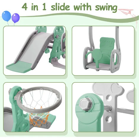 Avec une large gamme d’options de jeu, cette aire de jeux multifonctionnelle pour enfants offre à vos enfants plus de joie et d’options d’exercice. Notre produit a passé la certification de la série EN71. Le look coloré, les matériaux s?rs et les conceptions réfléchies de cette aire de jeux pour enfants plairont aux enfants tout en les protégeant pendant qu’ils jouent. Cette aire de jeux pour enfants 4 en 1 comprend un toboggan, une échelle, une balan?oire, une balan?oire et un panier de basket. Dans cette situation, vos enfants peuvent profiter de différentes fa?ons de jouer et jouer avec leurs amis à la maison. La conception détaillée de ce produit garantit la sécurité de vos enfants lorsqu’ils jouent. Et la configuration humanisée de ce produit prend non seulement en compte la sécurité des enfants, mais également une installation facile pour les parents. Cette aire de jeux pour enfants 4 en 1 est un choix parfait pour vos enfants à l’intérieur ou à l’extérieur.