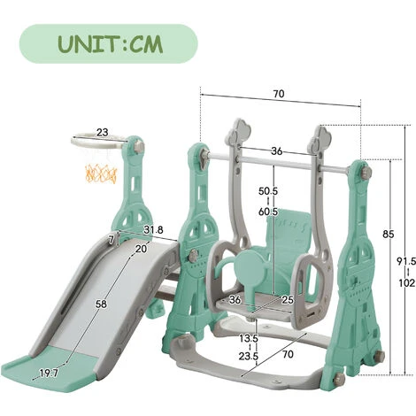 Cette aire de jeux pour enfants 4 en 1 est livrée avec une pompe à air et un ballon de basket assorti. Les utilisateurs peuvent profiter de toutes les fonctionnalités une fois qu’ils les ont assemblées à la réception. Le manuel d’instructions logique aide les utilisateurs à assembler cette aire de jeux pour enfants dans les bonnes étapes. La hauteur de balancement du jouet est réglable pour s’adapter aux bébés de différentes hauteurs.