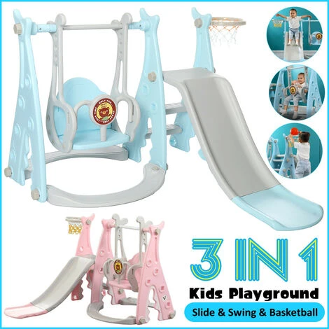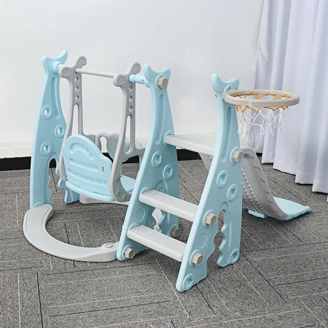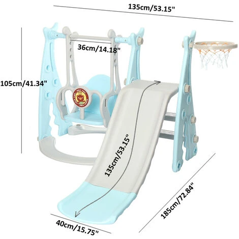 -L’ensemble toboggan et balançoire a quatre fonctions : toboggan, support de basket-ball, balançoire robuste et grimpeur antidérapant.