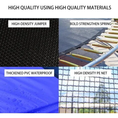 – Le cadre du trampoline est en acier galvanisé, qui présente une forte résistance à l’oxydation. Les pièces de connexion spéciales combinent les différents accessoires de l’appareil pour assurer une plus grande stabilité.