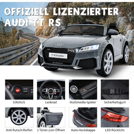 - 1. Audi TT RS Roadster Ride On: Un véhicule sous licence officielle avec 2 sièges, lumières LED, ceinture de sécurité, volant, moteur 2 × 30 W, Bluetooth, klaxon, port AUX et USB, emplacement pour carte TF, donne l’impression de conduire comme un vraie voiture.